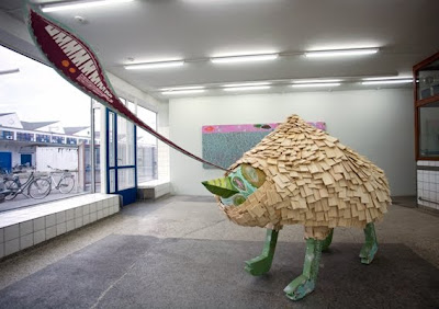 Working from found objects, Dasha Shishkin "obliterating and accentuating the found image with acrylic, crayon, ink and graphite, the artist transforms the repeating designs on fragments of wallpaper and fabric into complex images of the life cycle."